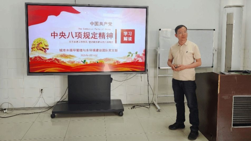 2025 年 4 月 16 日,城市水循环管理与水环境建设团队党支部组织全体党员开展 “学习中央八项规定精神,改进工作作风、密切联系群众”专题党课。支部紧扣“学思践悟、实干笃行”主线,通过深度解读政策内涵、结合行业特点谋划落实举措,以全国党建工作样板支部的高标准推进党建与业务深度融合。本次专题学习由支部纪律委员胡以松领学,全体党员认真观看幻灯片,并在会上展开热烈讨论,分享学习心得和体会。首先,胡以松带领全体党员回顾了 ...