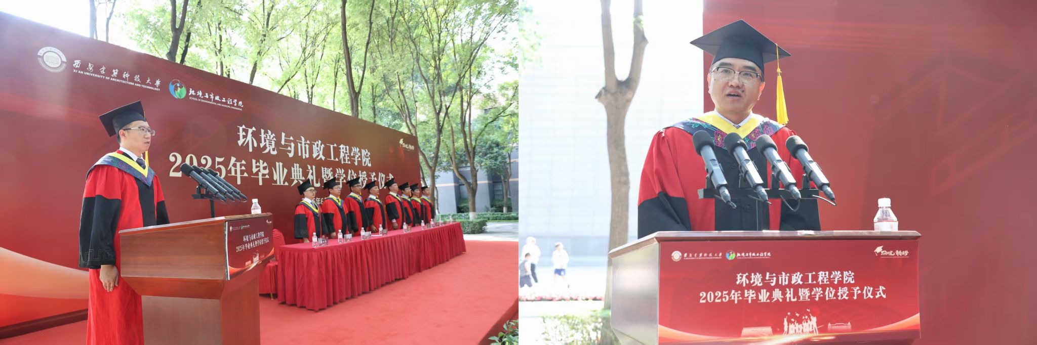 全体教师向2025届毕业生送上诚挚的祝福。他以“滴水世界”为喻,希望广大毕业生在未来的岁月里,能像具有强大自净能力的水体一样,不断汲取智慧、沉淀心性、涤荡灵魂,在时代的洪流中永葆内心的澄澈与方向的明晰,书写属于新一代环境人的壮丽诗篇。