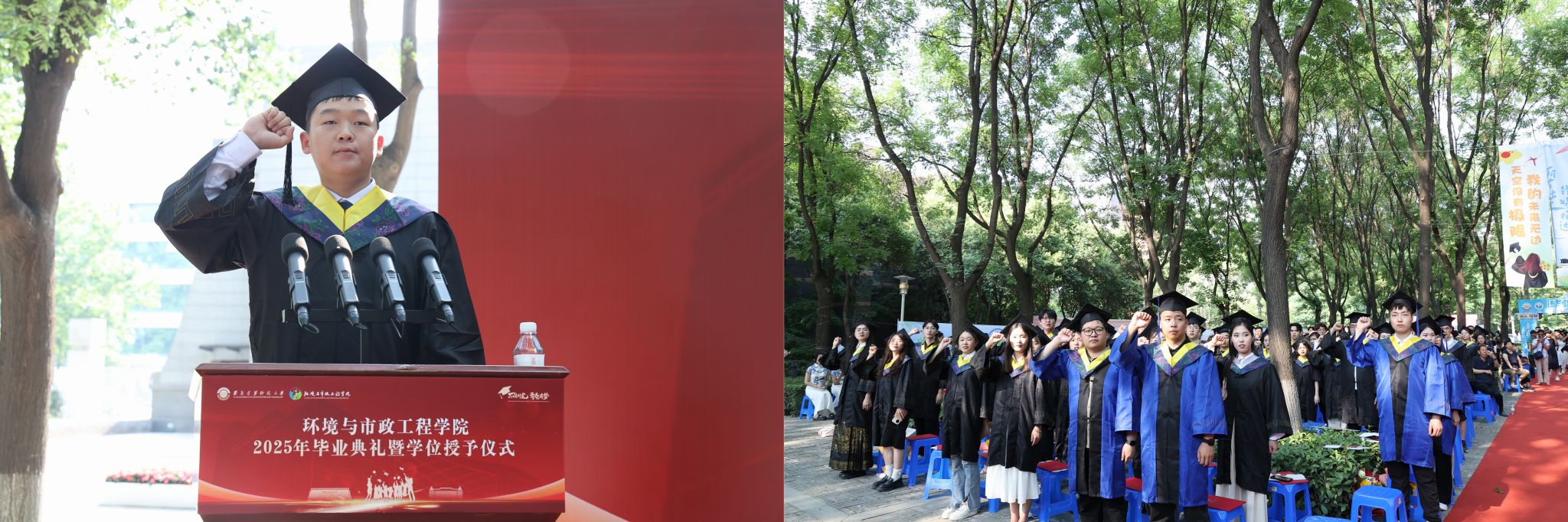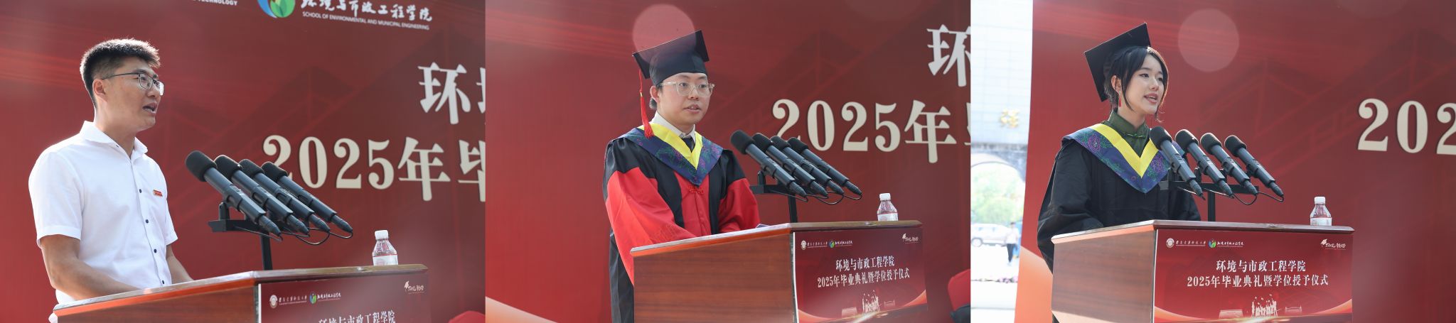 毕业研究生代表环境科学与工程专业2021级博士研究生马奔同学,毕业本科生代表给排水科学与工程专业2103班杨博澜同学代表毕业生发言。他们深情回顾了在建大从青涩到坚定的蜕变历程,分享了在挑战与机遇中收获的“三重温度”与成长感悟,感恩母校与师长将“象牙塔”建成了能望见山河方向的“瞭望台”,并表示将带着“爱我环工,永攀高峰”的信念与“守护初心”的担当,在各自的领域里续写建大环境人的精彩篇章。