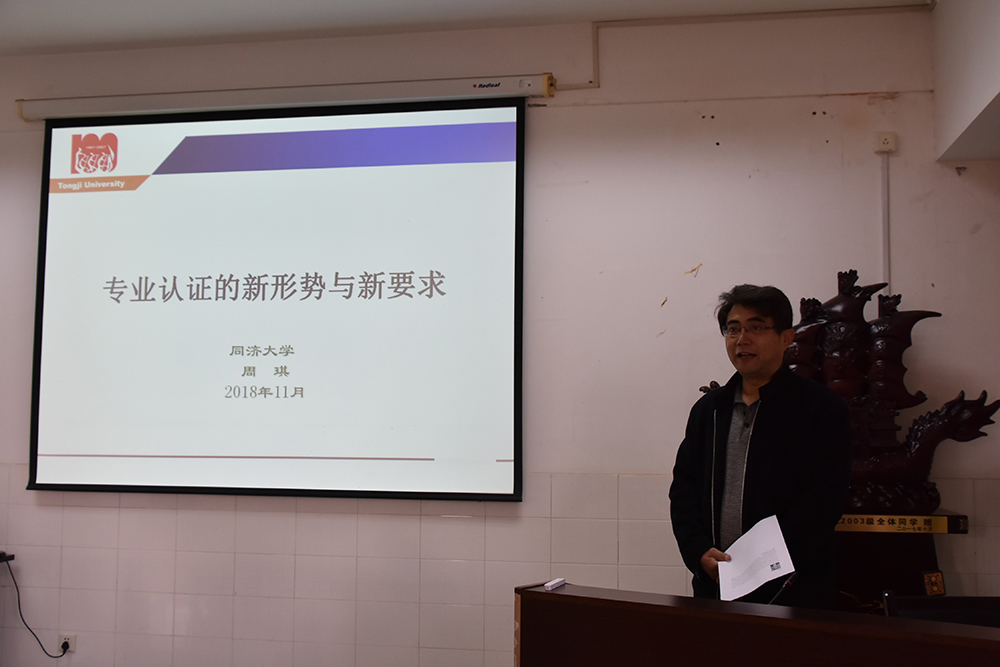任勇翔院长主持会议并致欢迎辞,周琪教授作了题为《专业认证的新形势与新要求》的主题报告。会上,周琪教授从三个方面介绍了工程教育认证的新要求,一是工程教育认证的新形势,二是如何准备专业认证,三是如何开展专业自评。通过对工程认证标准2017版的解读,并结合相关案例,提出专业认证自评报告撰写要求及相关注意问题。报告会后,与会老师针对自评报告的撰写、支撑材料的准备等问题,与周琪教授进行了讨论交流;最后任勇翔院长对报告内容进行总结归纳。