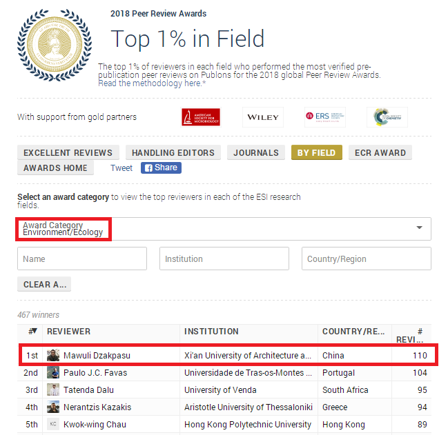 Mawuli Dzakpasu副教授同时在环境与生态学(大陆地区排名第一)、工程学两个学科获奖。