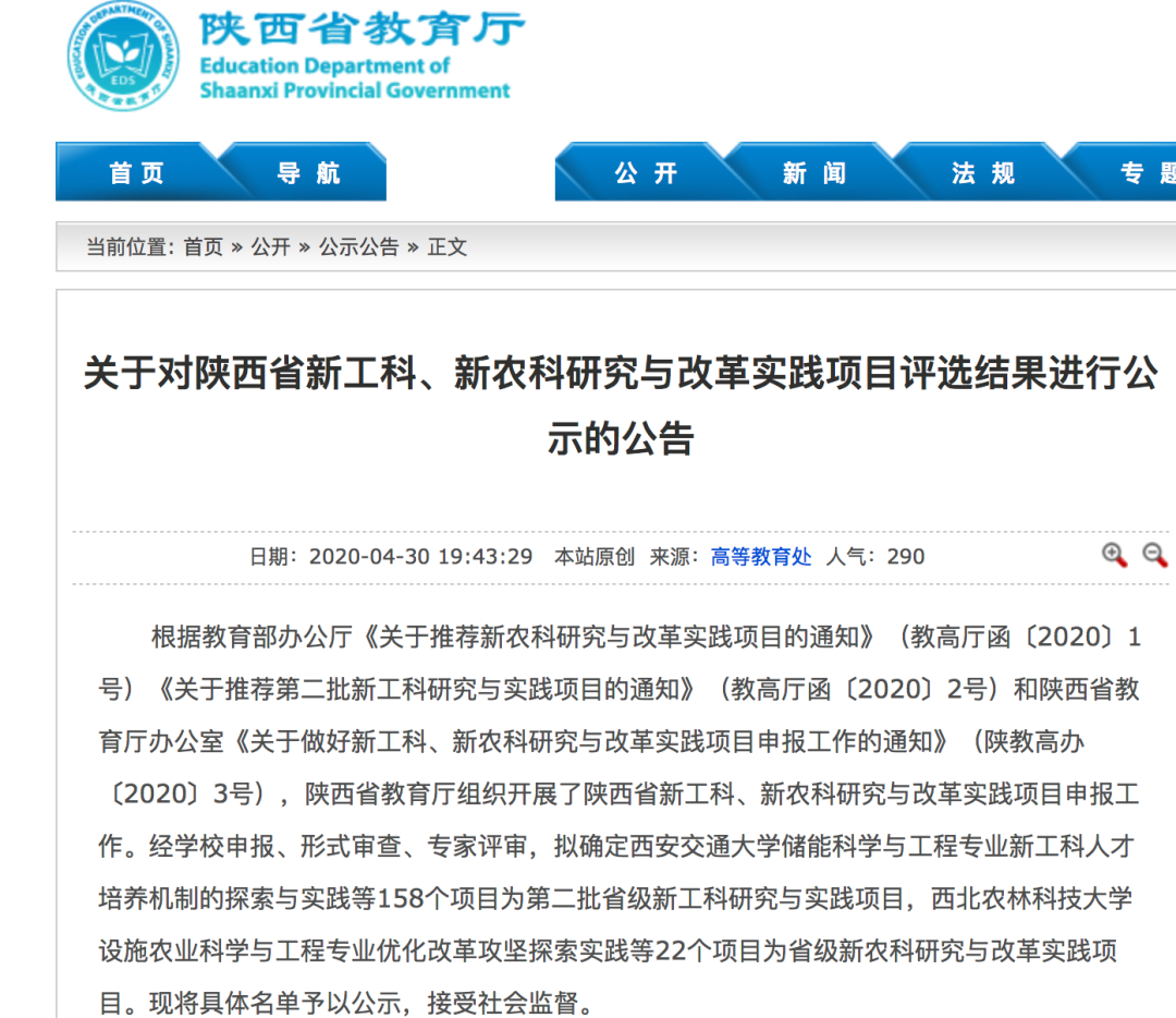 近日,陕西省教育厅在官网上公示了新工科、新农科研究与改革实践项目评选结果,共有180个项目进入公示名单。