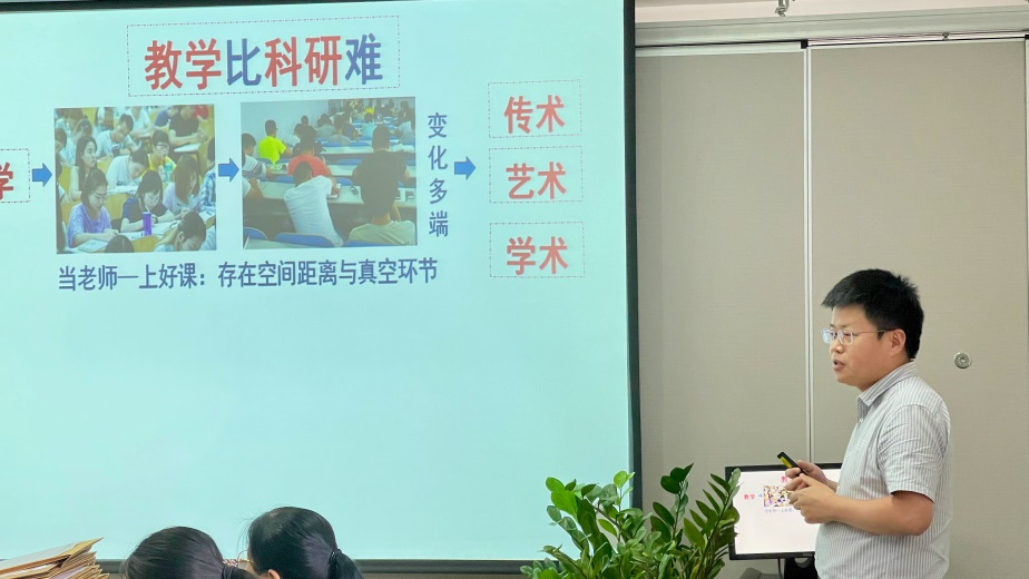 会上,张海涵副院长和大家分享了自己对于教学和科研的体会,总结了“教学贵在积累、科研贵在创新”等观点。针对目前教研室45岁以下青年教师较多,且所经历的科研训练较为系统,但教学训练薄弱的现实,他建议青年教师教学上不要贪多,要深耕细作,不断熟悉教学内容,创新教学方式,提高教学水平。他强调了教改项目的重要性,提倡大家积极参与,从校级到省级,由低级别到高级别,聚沙成塔集腋成裘,慢慢积累出教学成果。关于研究生指导,对某些困扰青年导师的问题,他与大家就如何培养不同基础、不同特点的研究生进行了全面深入的交流,结合他自己的做法,给出了中肯的意见。作为分管学院研究生教育和科研工作的副院长,他向大家介绍了学院在这两方面所做的工作和后续计划开展的工作,通过他的视角,让老师们了解了学院建设和发展的更多信息。