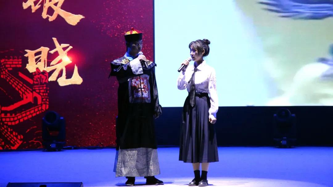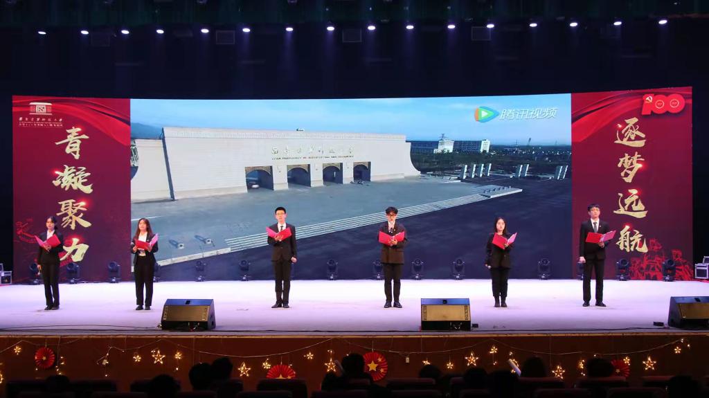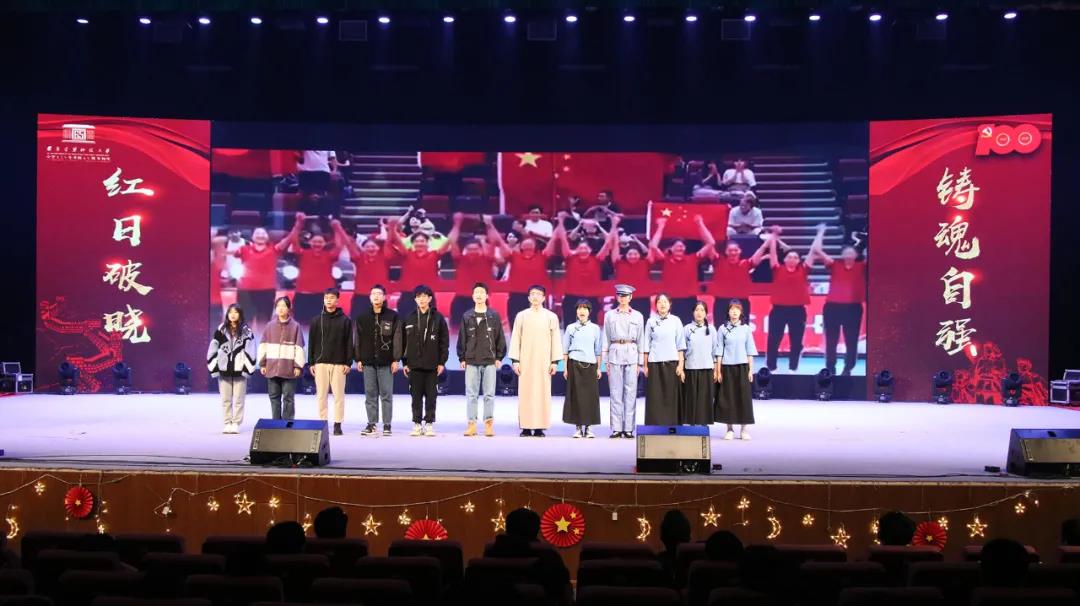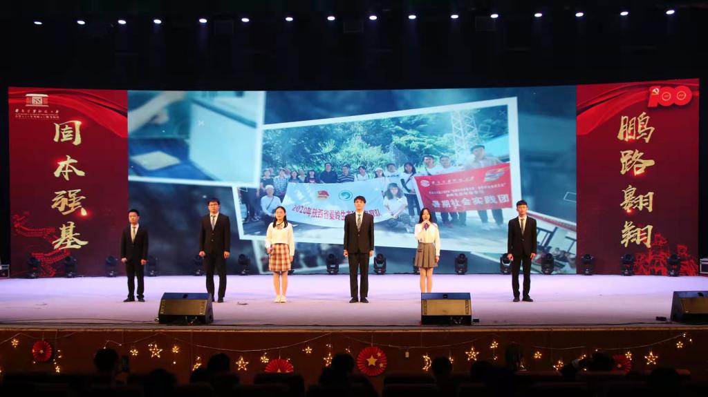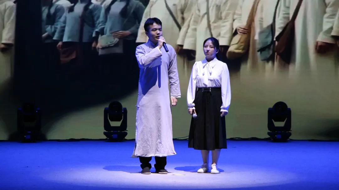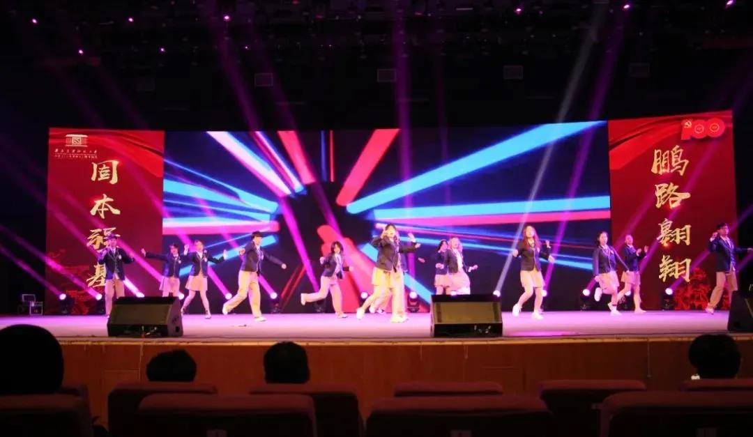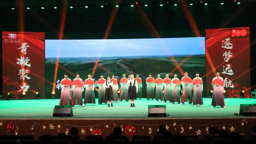 晚会在激动人心的开场视频中正式开始,视频回顾了学院一年来的主要学生工作和所获得的各项荣誉。随着倒计时的声声响起,开场舞《再唱山歌给党听》盛大开场。慷慨激昂的歌声,欢快活泼的舞蹈,伴随着歌声正跃动,她们的一颦一笑之间,都表达了对党的祝福。百年征程波澜壮阔,百年初心历久弥新。穿越百年历史,当年的那艘小船,已成为领航中国行稳致远的巍巍巨轮。如今中国早已换了人间。