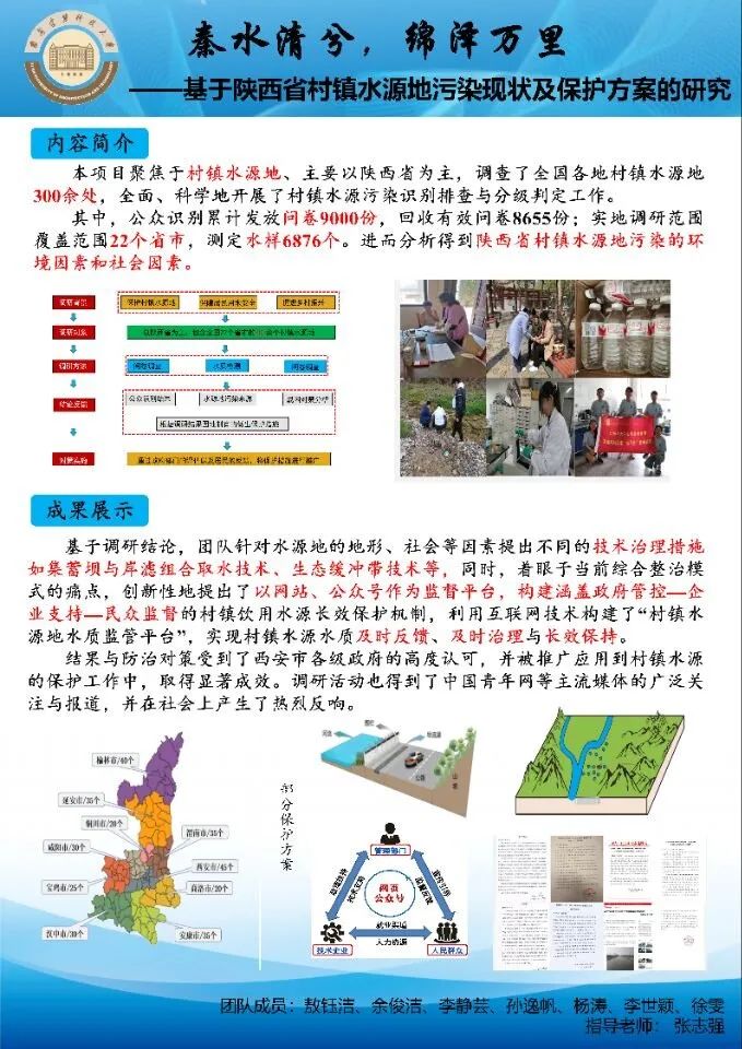 作品简介:随着经济的不断发展,村镇水源地受污染情况严重,村镇地区饮用水安全保障不足,为了深入了解村镇地区水源地现状,探索村镇水源地保护的有效方法,保障村镇地区居民用水安全,同时响应“十四五”规划中关于“持续改善环境质量,完善环境保护、节能减排约束性指标管理”及“实施乡村建设行动”的号召,团队以陕西省为主,调研村镇水源地300余个,回收有效问卷5000余份,检测水质2000余次,明确当前村镇水源污染主要来源于农业污染,生活污染,此外由于地形等原因,一些特殊环境下的水源地,缺乏相关指导文件参考,对其实施保护措施更是无从下手。基于此,团队综合考虑环境、社会、经济效益等因素,通过各种水源地的实地研究,提出适合村镇水源地的保护方案,例如:集蓄坝与岸滤组合取水技术、生态缓冲带技术、特殊水源地的保护等。通过政府以及居民的反馈结果表明,团队提出的保护方案在社会、环境以及经济方面都具有较大的优势,节能减排效果尤为突出,从源头上减少水源污染,保障民众饮用水安全,推动政府水环境治理工作,获得了政府部门的一致好评,保护方案被各部门采纳和推广。