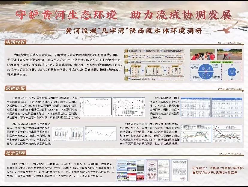 团队从水资源、水环境、水生态3个方面共23个四级指标,构建水资源承载力模型,创立水资源优化配置模型,分析最优水资源配置,并形成《黄河流域陕西段水资源承载力调研报告》等系列报告与对策方案,被陕西省生态环境厅采纳。