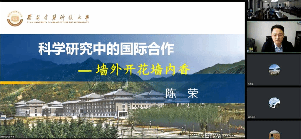 会上,陈荣教授作了“科学研究中的国际合作”专题报告。他首先从国家基金委、国家科技部、陕西省科技厅三个渠道阐述了国际科技合作项目的设置体系及特点;随后他结合自身经历提出了项目申报的经验和启示,即“用好平台、讲好故事、做好增量”。接着他简要介绍了我校国际交流与合作概况,并强调要抓住学校成立“丝路国际建筑科技大学联盟”的机遇,高度重视与“一带一路”国家在人才培养、科学研究、学术交流等方面深化合作。最后他呼吁,在学院统筹安排和教师不懈努力下,将承担高层次国际合作项目、产出高水平科技创新成果、培养高质量国际胜任人才、营造浓厚的国际化氛围作为国际化工作发展的目标与方向,不断提高学科国际化水平,助力学院高质量发展。
