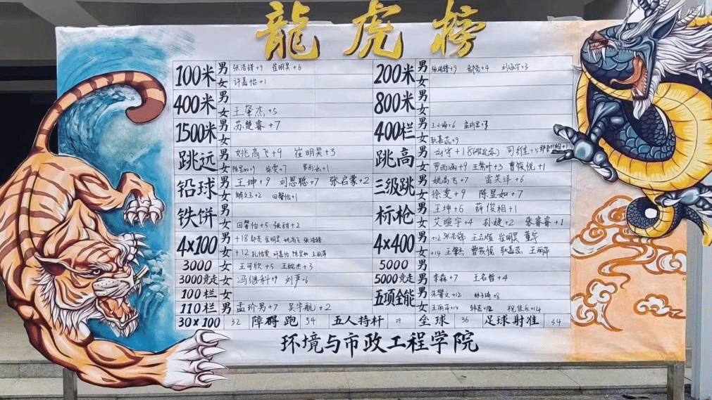 运动员们凭借着顽强的斗志和雄厚的实力,赛出体育竞技精神,取得了男子团体总分第二名,女子团体总分第二名,团体总第一名的好成绩。“爱我环工,勇攀高峰!”这句激情飞扬的口号深深刻进了每位环境学子的脑海里。