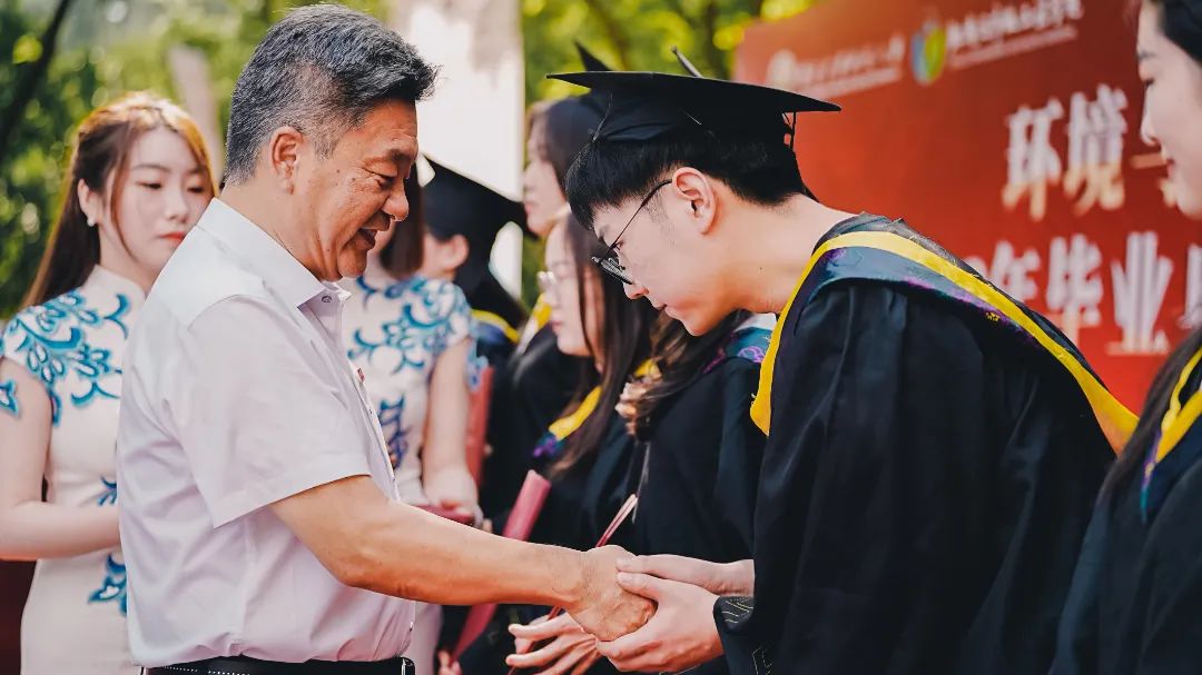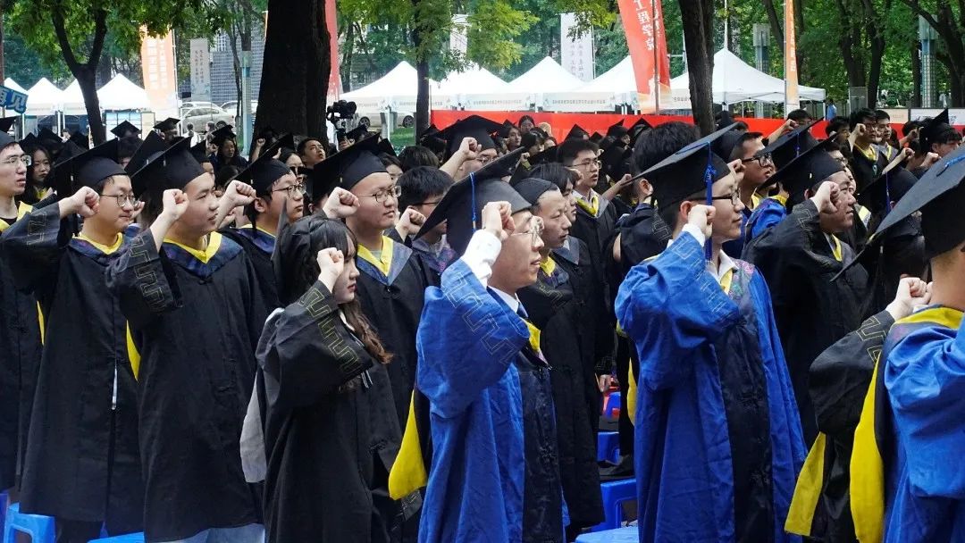 典礼仪式在毕业生宣誓明志环节进入高潮。环工1903班吕博昊同学带领全体毕业生进行宣誓:铭记母校校训“自强、笃实、求源、创新”,谨遵师长教诲“正心、明德、励志、笃行”;发扬优良传统,传承母校精神,肩负时代使命,争做时代精英;坚守真诚,坚守真理,坚守信念,忠诚国家,忠诚社会,忠诚执着;用青春和汗水开拓未来,用聪明和才智创造明天,为实现成才报国的梦想,铸造中华民族的辉煌,奋斗终生。