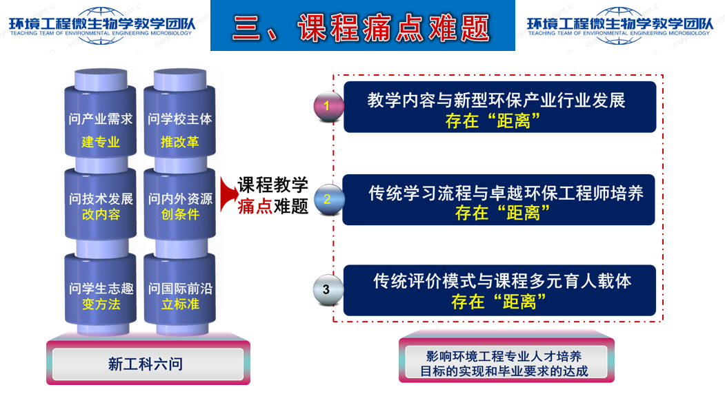 张海涵老师主讲的《环境工程微生物学》是环境工程专业人才培养体系的九大核心课程之一,面向三年级本科生开设。基于课程建设历程和学情分析,《环境工程微生物学》虽然是一门建设历史悠久的课程,但是面向“新工科六问”的教育理念,在教学实施过程中面临三大痛点难题,影响环境工程专业人才培养目标的实现和毕业要求的达成。