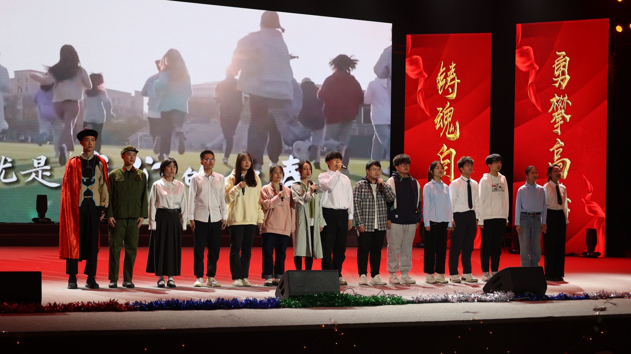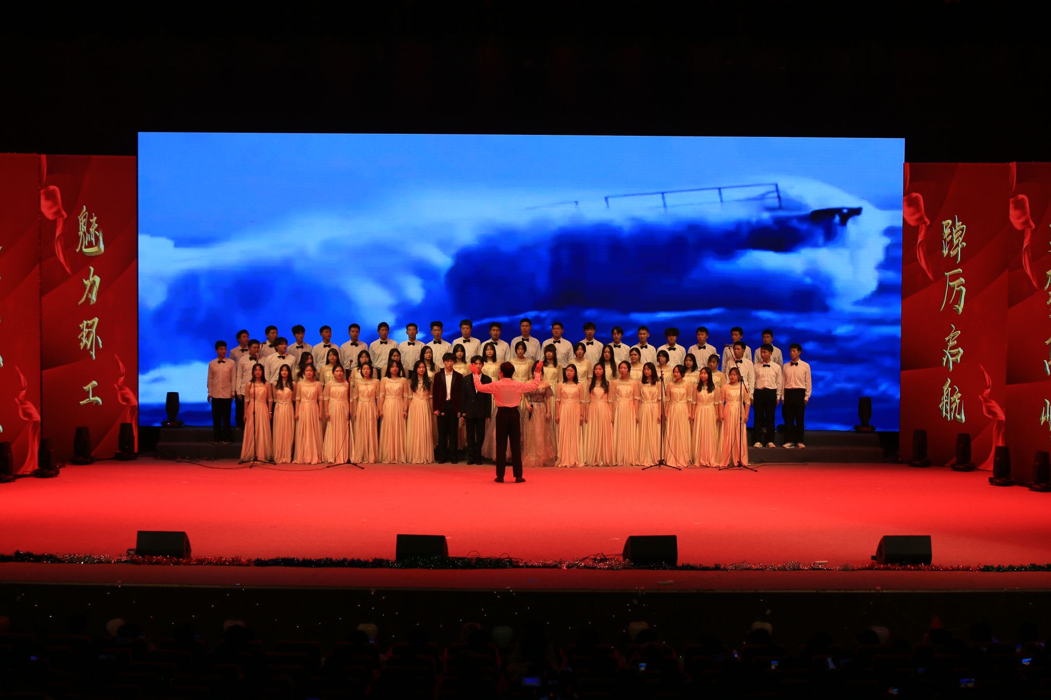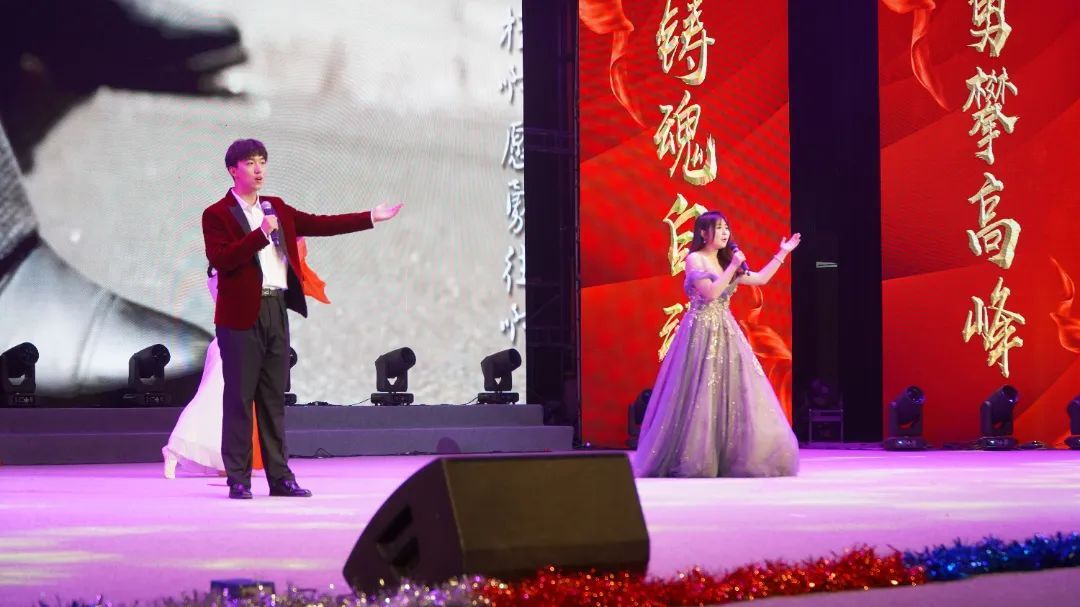 晚会在激动人心的开场视频中正式开始,视频回顾了学院一年来的主要学生工作和所获得的各项荣誉。随着一声声倒计时,舞蹈《再唱山歌给党听》盛大开场。慷慨激昂的歌声、优美婀娜的舞蹈,一步一动间,描绘了党的102年风雨兼程;一颦一笑间,表达了对党的衷心祝福。波澜壮阔已百年,开天辟地换人间。当年嘉兴南湖上的小小红船,早已成为当今国际的时代巨轮,将继续载着我们乘风破浪、勇立潮头。