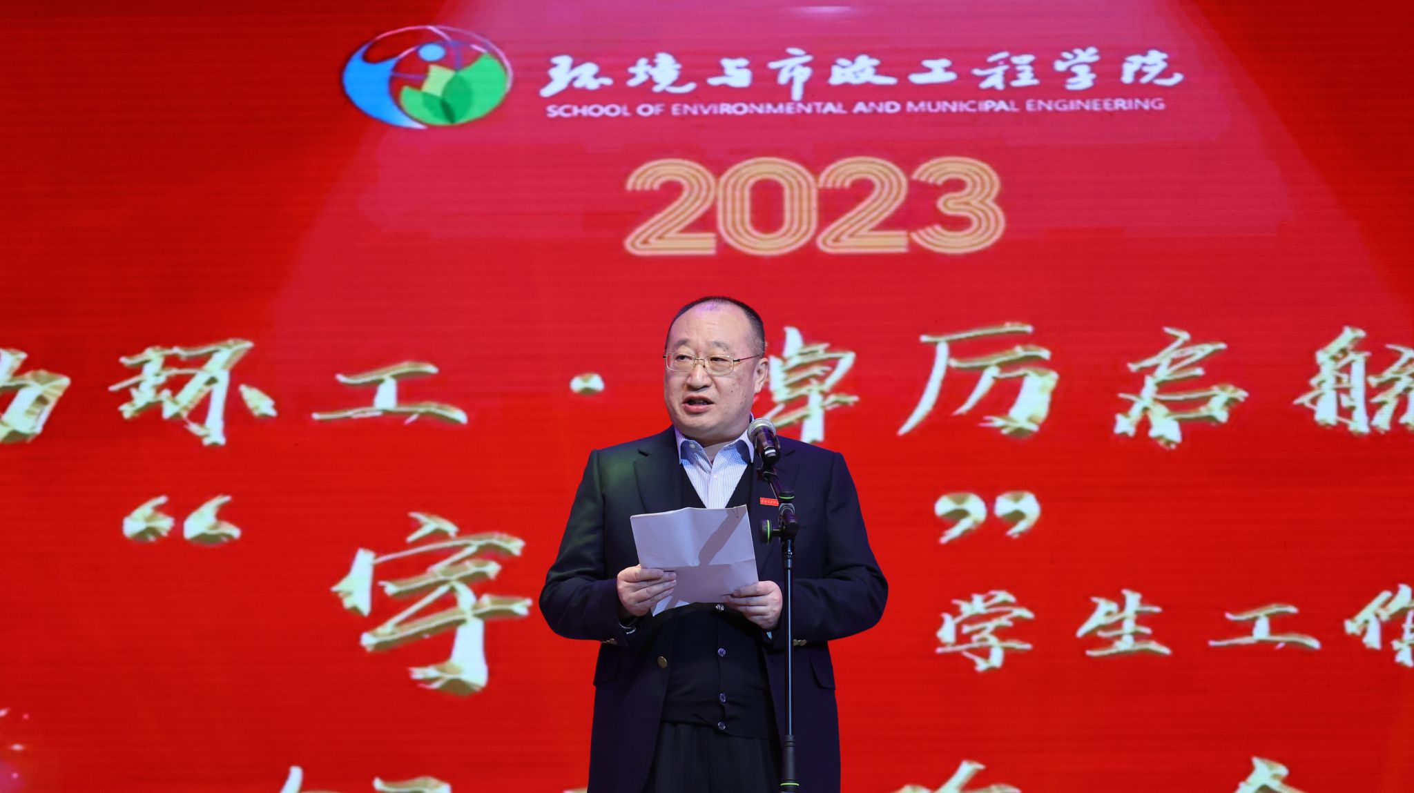 党委书记王劲松代表学院致辞并宣布晚会正式开始。王书记指出,67载以来,一代代建大环境人与时代共进步,根扎西部,立足行业,奋发图强,为建成特色鲜明、国际知名、国内高水平大学做出了重大贡献。他强调,殊为不易的成绩, 离不开广大校友的关心支持,校友是学院宝贵的资源,是学校影响力的传播者和建设发展的重要支持力量。同时,他阐释了设立南海翔南“宇丹”学生工作突出贡献奖的重要意义和初心,并鼓励学生干部在思想、学习、生活、工作等方面高标准、严要求,起好桥梁纽带作用,团结带领广大青年学生,为学校“双一流”建设凝聚青春力量。