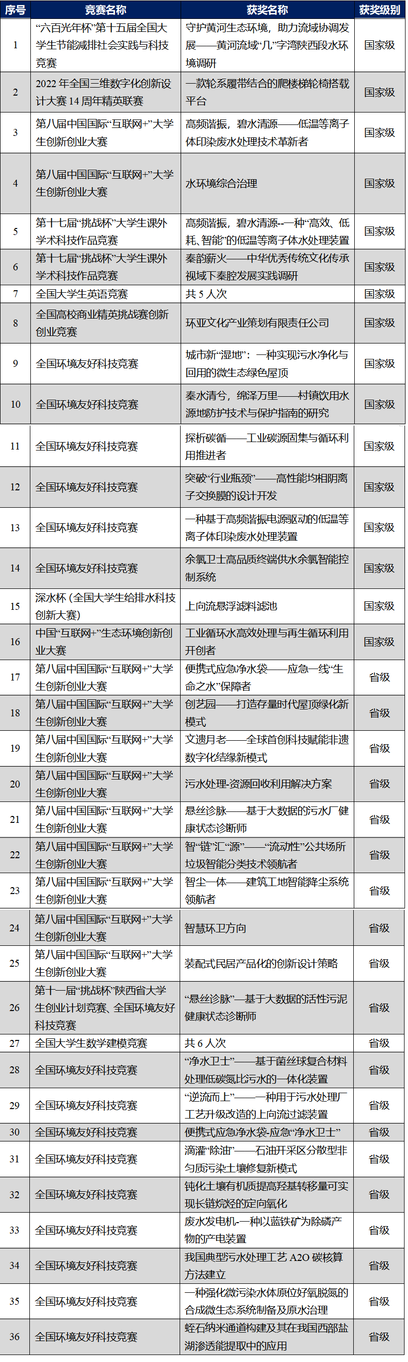 表1 环境工程专业在校生2022年度双创与学科竞赛获奖(国家级/省级)