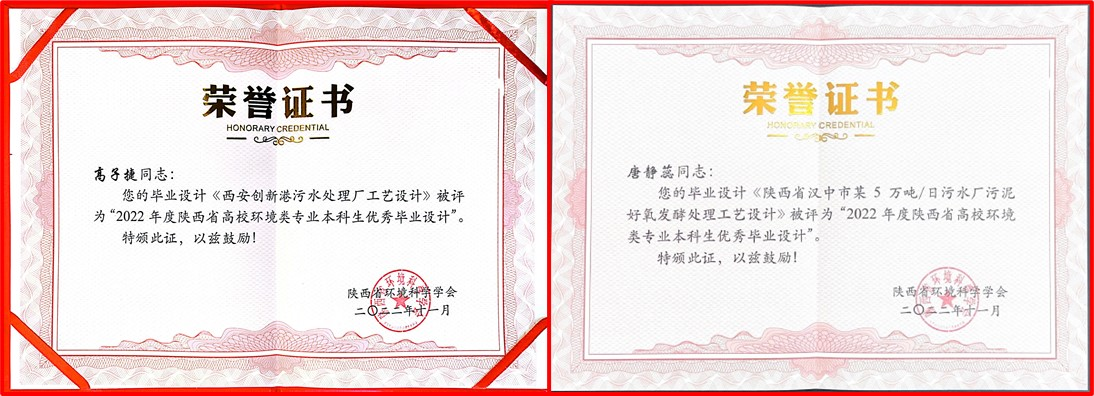 2022年本专业本科在校生积极参加各级各类创新创业与学科竞赛活动,累计获奖247人次。其中,国家级获奖43人次,省级获奖34人次,相关获奖项目如表1。本科生唐静蕊(指导教师:韩芸)、高子捷(指导教师:袁林江)获陕西省高校环境类专业本科生优秀毕业设计奖(图1)。