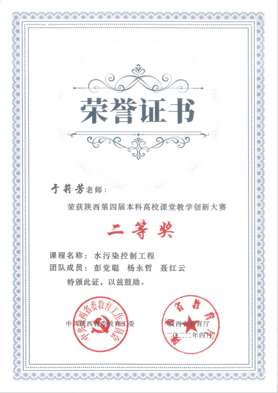 为促进专业教师教书育人能力水平,形成良好的教学研究氛围,本专业坚持“以赛促教、竞教结合”的教师教能促进机制,形成了一系列创新教学方法和教学手段。近年来,张海涵(环境工程微生物学)、杨生炯(环境工程原理)在陕西省高校课堂创新大赛分获一、三等奖。同时,张海涵老师所在的“环境工程微生物学”课程团队,获全国首届高校教师教学创新大赛地方高校正高组三等奖。2022年度,于莉芳老师代表“水污染控制工程”课程团队获陕西省第四届本科高校课堂教学创新大赛二等奖(图2)。