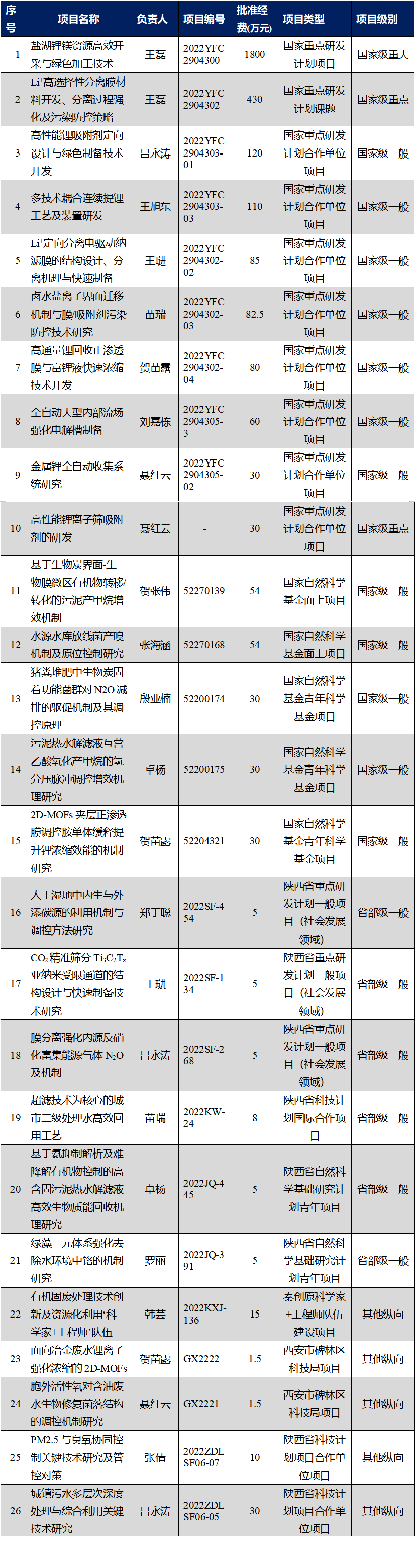 围绕盐湖卤水锂镁资源开采、水源水质保障、固体废弃物处置、工业废水处理、城市生活污水处理、氮磷资源回收等环境、资源、生态领域关键问题,2022年环境工程教研室共承担国家级、省部级纵向项目32项,累计批准科研经费超2100万元。其中,国家级重大项目1项,国家级重点课题1项,国家自然科学基金面上项目2项,国家自然科学基金青年项目3项,省部级项目6项,厅局级重点项目5项、一般项目3项,具体情况如表3: