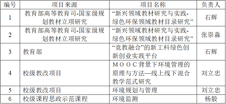 2022年度环境科学教研室新入职教师2名,至此教研室共计22名教师,其中具有博士学位专业教师占比超过90%,教授3名,副教授8名(含外籍副教授1名),高级职称占比达到50%。2022年承担教育部高等教育司“新兴领域教材研究与实践-绿色环保领域教材目录研究”项目2项、“竞教融合”的新工科绿色创新创业实践平台项目1项、全国高校黄大年式教师团队申报1项。主持校级教学改革研究2项、校级思政课程建设1项,建设运行省级一流本科课程项目1项,出版教材1部。