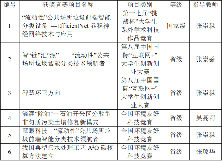指导学生参加挑战杯“黑科技”专项赛、环境友好科技竞赛、互联网+等创新竞赛获奖等各类国家级省部级竞赛10余次,获得国家级奖励1项,省级奖励5项。
