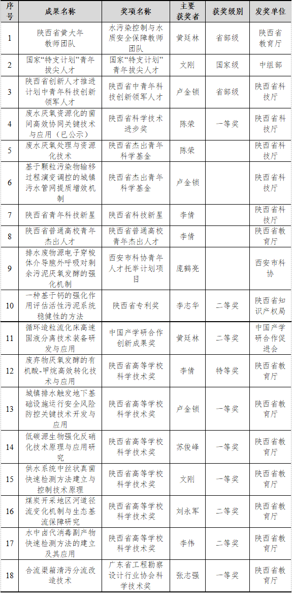 2022年给排水教研室新增1名国家“万人计划”青年拔尖人才,1名陕西省中青年科技创新领军人才,2名陕西省杰出青年科学基金项目获得者,1名陕西省科技新星,1名陕西省普通高校青年杰出人才,1名西安市科协青年人才托举计划项目;获得陕西省科学技术进步奖一等奖1项,中国产学研合作创新成果奖二等奖1项,陕西省专利奖二等奖1项,陕西省高等学校科学技术奖特等奖1项、一等奖3项、二等奖2项,广东省工程勘察设计行业协会科学技术奖1项。