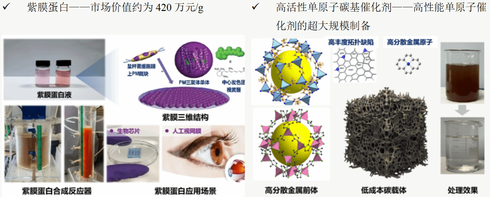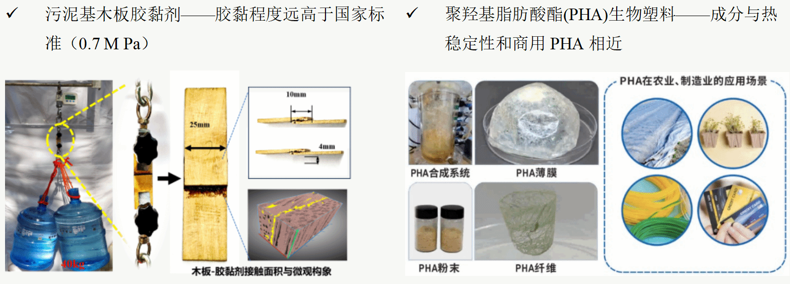废水废弃物高值资源化技术与产品:研发了废水废弃物多目标资源化系列技术,制备了污泥基木板胶黏剂、可生物降解塑料、紫膜蛋白、高活性单原子催化剂等高附加值产品。