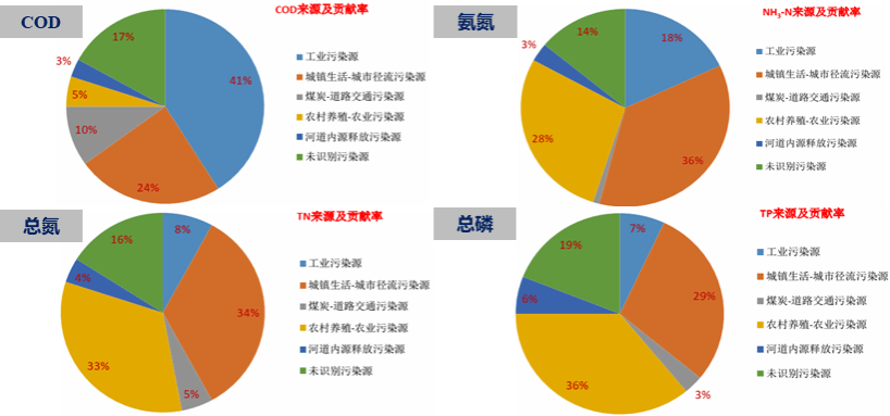 图4 污废水中COD、氮、磷来源及贡献率分析