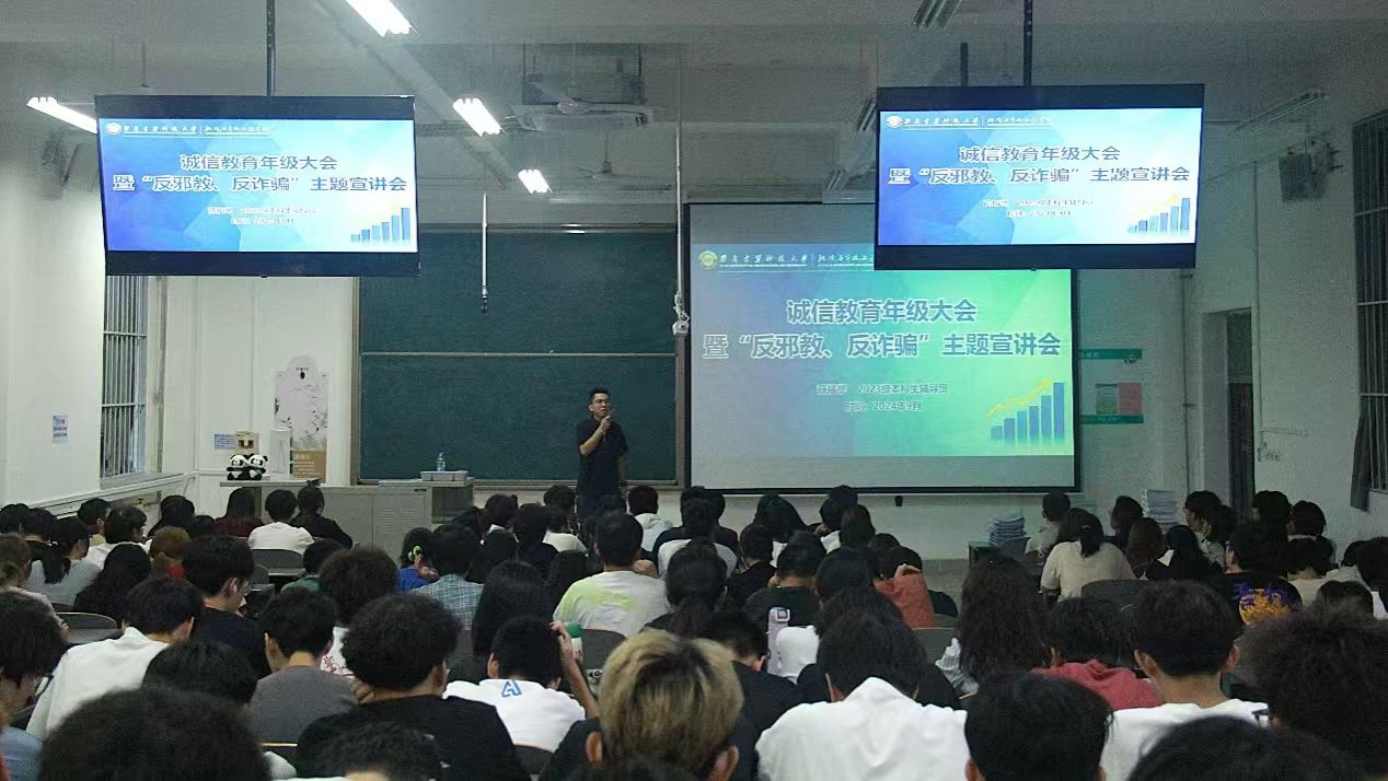 于2024年9月25日18:30在学府城8-106、8-202召开2023级本科生诚信教育年级大会暨“反邪教、反诈骗”主题宣讲会。