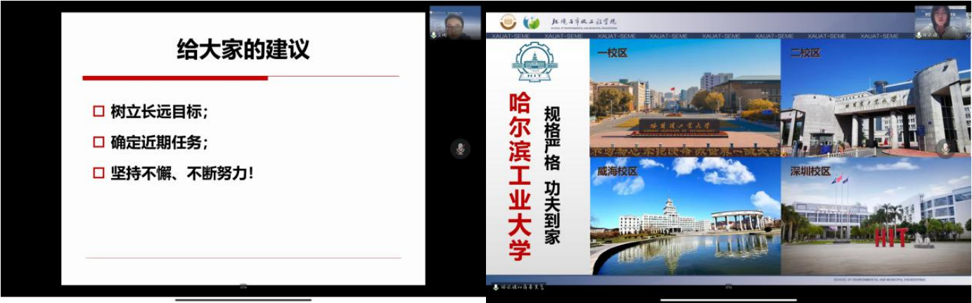 首先由田识琪老师进行了以《领略世界名校风采恪守建大工匠精神》为主题的介绍,并邀请到了文刚老师作为特邀嘉宾,田老师向同学们图文并茂地展示了哈尔滨工业大学和新加坡国立大学的特色与风采,并对大家未来的学习提出建议及一些经验的分享。