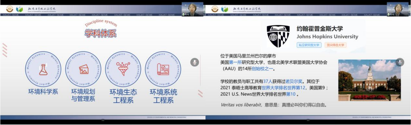 最后由杨晴老师以《穿越百年历史追溯环境之旅》为题,向大家分享了北京师范大学和约翰霍普金斯大学的学科体系及这两所学校在环境工程系的斐然成就。