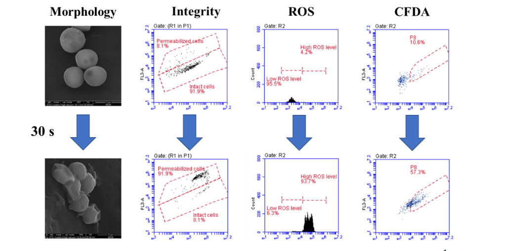 使用流式细胞仪结合三种染色剂(SG/PI、DHE、CFDA)以及扫描电镜分析深入探究了臭氧对真菌孢子的灭活机制。臭氧首先破坏真菌孢子的细胞壁和细胞膜,这一过程促进了臭氧分子进入细胞内部并与胞内化合物反应,在这一快速过程内,真菌孢子受到外界强烈氧化刺激,产生应激反应,导致胞内活性氧(ROS)水平和酯酶活性急剧升高,随后,真菌孢子在臭氧分子和ROS的联合作用下被逐渐灭活。