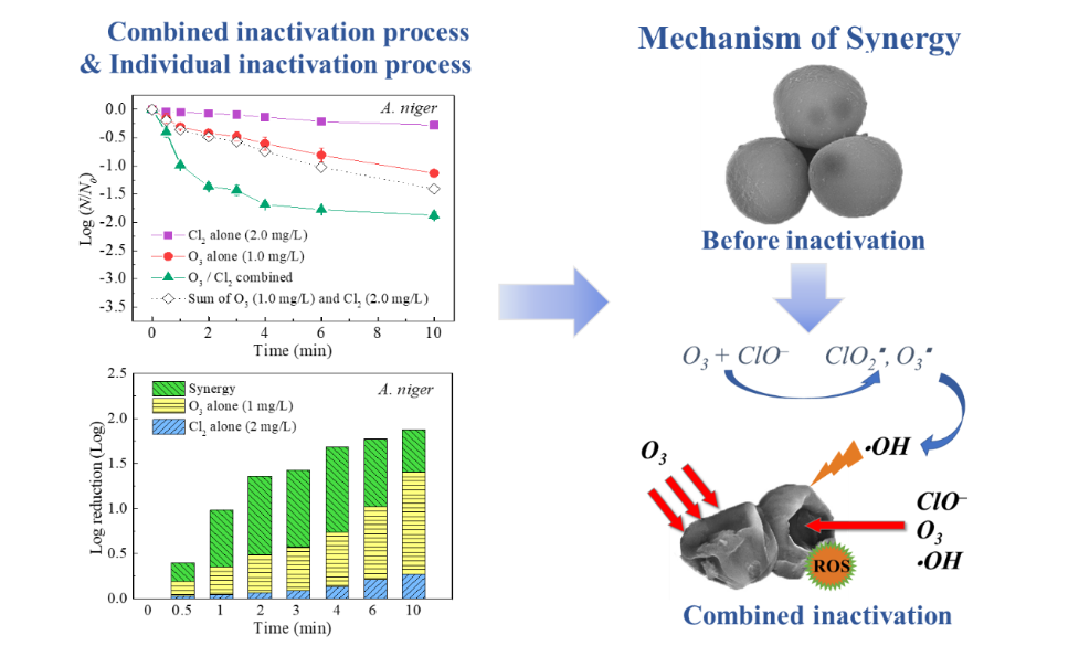 文刚教授课题组硕士梁智婷在环境领域国际著名期刊Water Research(SCI一区,IF=11.236)和Journal of Hazardous Materials(SCI一区,IF=10.588)上连续发表题为“Inactivation of fungal spores in water using ozone: Kinetics, influencing factors and mechanisms”(2020,116218)以及“Synergistic effect of ozone and chlorine on inactivating fungal spores: Influencing factors and mechanisms”(2021,126610)两篇重要成果。两篇论文针对臭氧对水中真菌孢子的灭活效果展开研究,探究了臭氧分子对真菌孢子的灭活动力学,研究了影响灭活效果的环境因素,从细胞水平上深入分析了臭氧对真菌孢子的灭活机制;首次揭示了臭氧/氯联合灭活真菌孢子过程中产生了协同作用,并从细胞和分子水平探讨分析了协同作用的产生机理,对控制水源水中真菌污染、保障饮用水供水安全具有重要意义。
