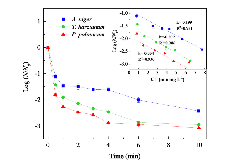 图1. 臭氧对三种真菌孢子的灭活过程以及动力学分析([O3]0 = 2 mg L−1, pH = 7.0, T = 20 °C)