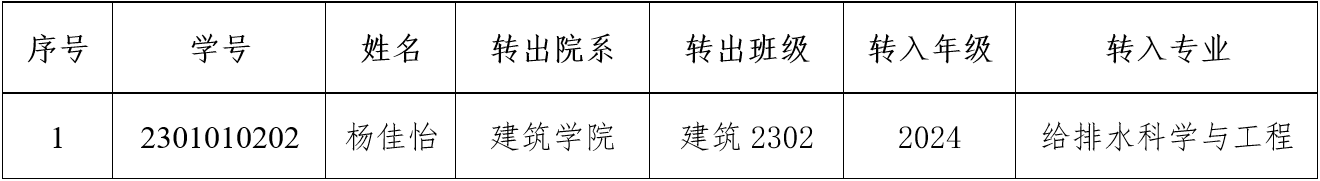 根据《西安建筑科技大学本科生校内转专业实施细则(修订)》(西建大【2021】21号)、《关于做好2024年本科生校内转专业工作的通知》(西建大教【2024】15号)以及《spbo1手机比分 本科生校内转专业实施办法》的文件要求,spbo1手机比分 于2024年6月28日进行校内转专业面试工作,经学院面试考核,拟录取以下1名同学,现公示如下: