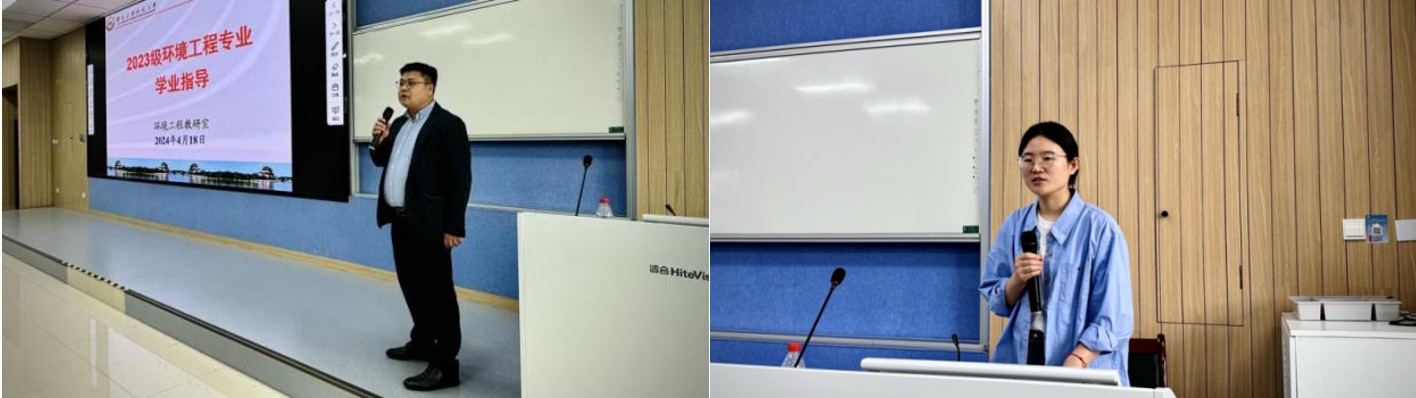 首先,殷亚楠为同学们介绍了我校环境工程专业的历史、发展等方面,并为同学们讲解了本专业的培养目标、课程设置、毕业要求等同学们息息相关的核心问题,解读了学院3+3综合素质培养体系以及学业导师制度,增强了同学们对本专业的认同感和自豪感。随后,环境工程教研室倪海燕作为新生班主任代表进行发言,以“春种一粒粟,秋收万颗子”为题,对2023级环工专业学生在学业、校园活动及生活方面寄予了期望。