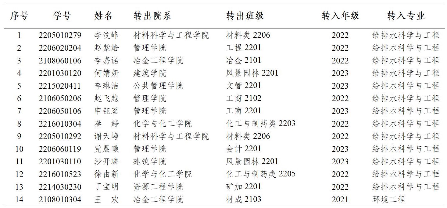 根据《西安建筑科技大学本科生校内转专业实施细则(修订)》(西建大【2021】21号)、《关于做好2023年本科生校内转专业工作的通知》(西建大教【2023】19号)以及《spbo1手机比分 本科生校内转专业实施办法》的文件要求,spbo1手机比分 于2023年6月20日进行校内转专业面试工作,经学院面试考核,拟录取以下14名同学,现公示如下: