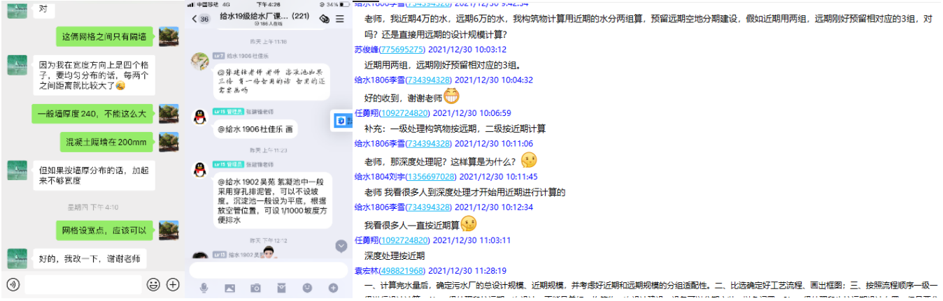 给排水科学与工程专业大三、大四学生的课程设计也不得不从线下指导转为线上指导。为实现“停课不停学”和“线上与线下教学质量同质等效”的目标,结合课程设计的特点,给排水教研室在指导教师“一对多”分组指导的基础上,积极组建泵站设计、给水厂设计和污水处理厂设计指导团队,通过QQ群和微信群及时解答学生疑问,确保了多门课程设计的顺利进行。