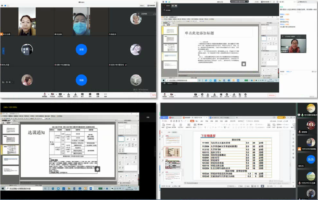 杜红霞老师对学校近期发布的选课通知进行了详细的解读。王会霞和张伟老师提醒同学们按时完成实习报告和实习日记,认真复习备考。杨毅和邢保山老师就线上学习可能存在的问题进行预演和答疑。张琼华老师鼓励同学们在疫情防控期间锻炼身体,保持昂扬向上的心态。唐聪聪老师勉励同学们专注而不紧张,从容而不放纵,将疫情封城的不利影响化为专业学习的动力。环科教研室的其他老师也都向同学们表达了关心,并利用微信、QQ等工具对同学们的疑问进行了解答。