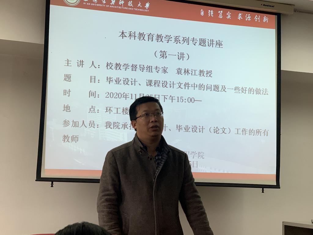 在环工楼512开展了本科教育教学系列专题讲座第一讲。讲座由校督导组专家袁林江教授围绕“毕业设计、课程设计文件中的问题及一些好的做法”进行讲解,教学副院长刘立忠、教学秘书朱陆莉以及承担了课程设计、毕业设计(论文)工作的所有教师参加了此次讲座。