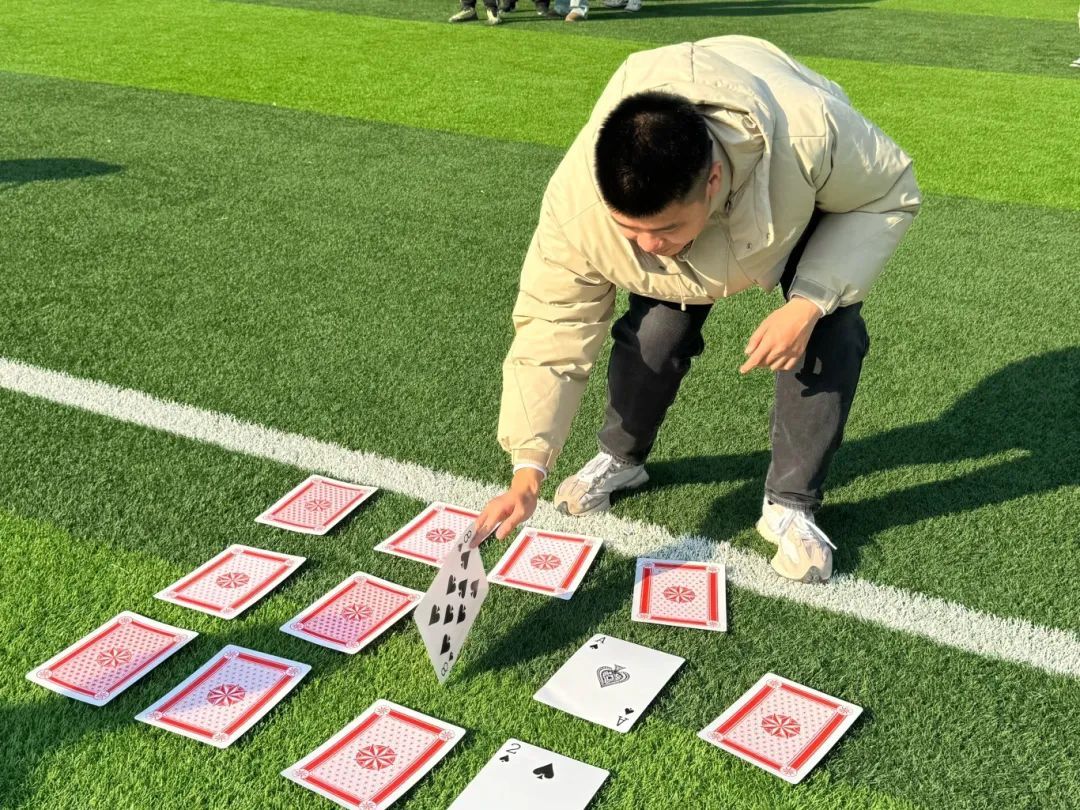 第二场“达芬奇密码”,成员列队,按顺序翻1-13号牌,错则复原,对则留正,依次类推至13,先完成为胜,队员们积极配合,全力以赴,由环境专业拿下第二场比赛胜利。由于赛制三比二胜出原则,环境专业赢得此次心理团辅趣味运动会冠军。